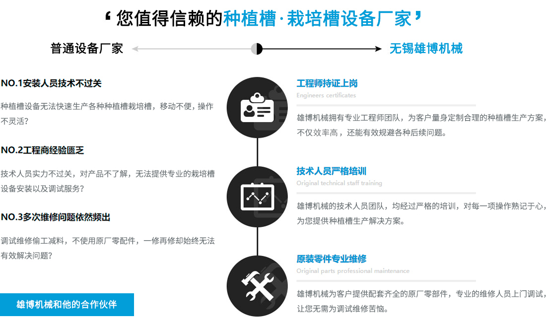 您在選擇雄博產品的同時,也選擇無微不至的終身服務。可根據不同客戶實際需求進行種植槽設備,栽培槽設備等的特殊工藝設計制造專業一對一售前/售后/技術咨詢指導,享受更貼心/放心的設備使用體驗。